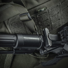 The multipurpose weapon belt from M-Tac will greatly simplify the handling of a rifle or carbine, and the well-thought-out design will ensure maximum convenience when using a weapon. This belt model provides both a two-point and a single-point fastening system. To use the belt in a standard two-point version, the sling is attached to the rear mount on the stock or to the QD swivel mount, and the metal carabiner to the handguard or barrel shroud of the rifle. To convert the weapon belt into single-point mode, it is enough to hook the carabiner over the D-ring located near the soft shoulder pad. An innovative metal buckle with a T-shaped lever ensures quick adjustment of the belt length.