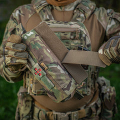 The outer shell is volume-adjustable and allows dual-side access to the IFAK. A quick-pull strap on the IFAK enables rapid deployment, and the two parts connect via velcro to prevent accidental loss.