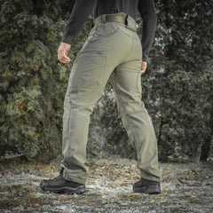 The M-Tac Soft Shell Winter tactical pants. The softshell fabric combines heat-insulating and "breathable" properties of fleece with wind and moisture resistance, strength of the outer layer. The outer surface blocks the wind, and the inner layer of the fabric wicks away excess moisture. It is used as a top layer in the off-season and in winter. For additional comfort in cold periods of the year, the manufacturer added a fleece lining.