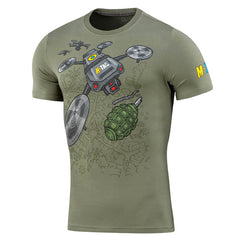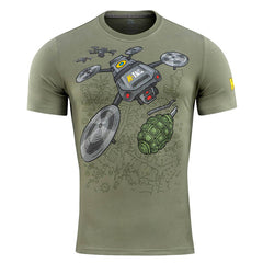 On the chest is a large graphic depicting drones flying over the battlefield and dropping grenades. On the back is a small print showing an F1 hand grenade, called "Lime" by the military, on a yellow and blue background. The surrounding inscription"Мовчить арта - кидай гранату" (Arta is silent - throw the grenade) defines the role and effectiveness of civilian drones, which Ukrainian engineers have adapted for continuous and accurate combat operations on the front line.